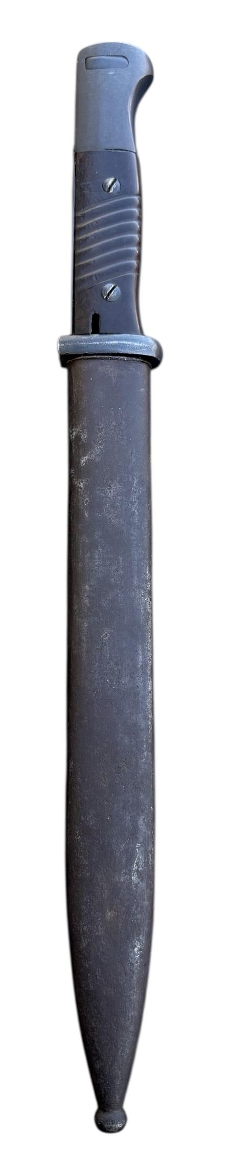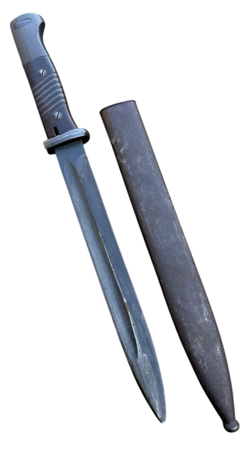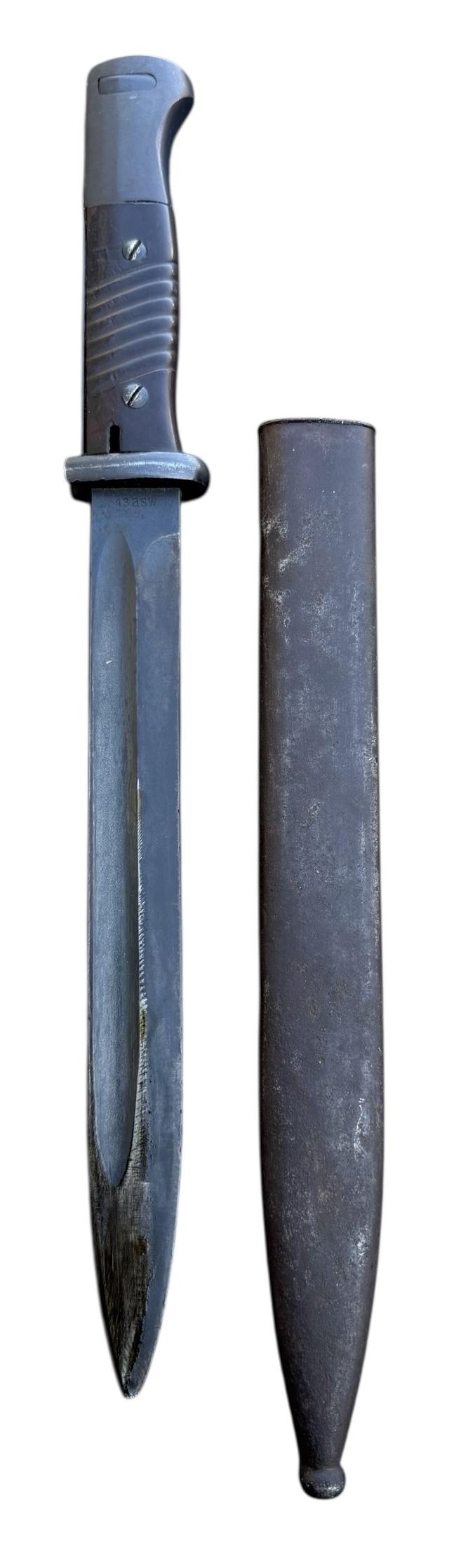 K98 Bayonet model 1884/98 Nice used K98 bayonet for the K98 Mauser Karabiner Maker code marked “ASW” and dated “1943” With non matching metal scabbard. Overall a nice used K98 bayonet in used but good condition.