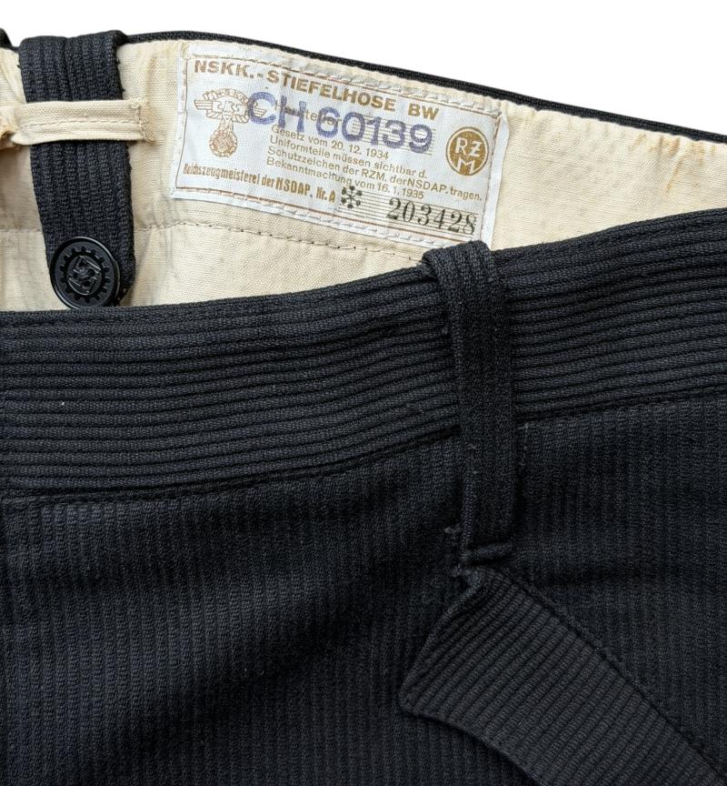 With a near mint pair of breeches with its original “RZM NSKK” cloth label. “NSKK Stiegelhose”