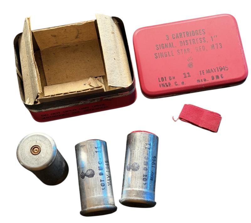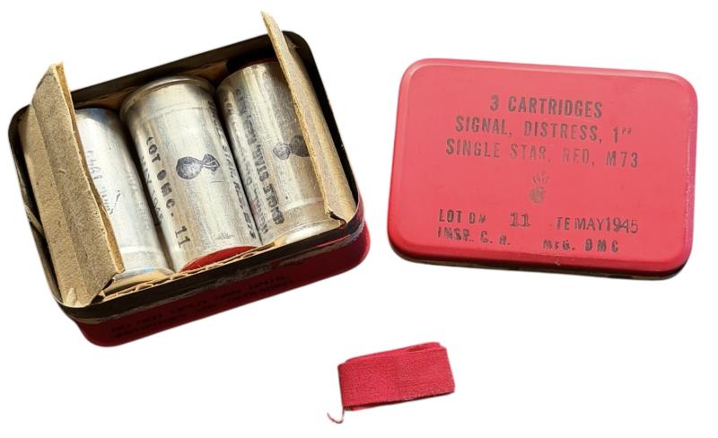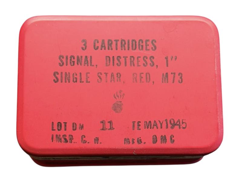 Very nice decorative US WW2 red metal tin with 3 (empty) red flares. Marked “3 Cartridges Signal Destress 1” and “Single Star Red M73”