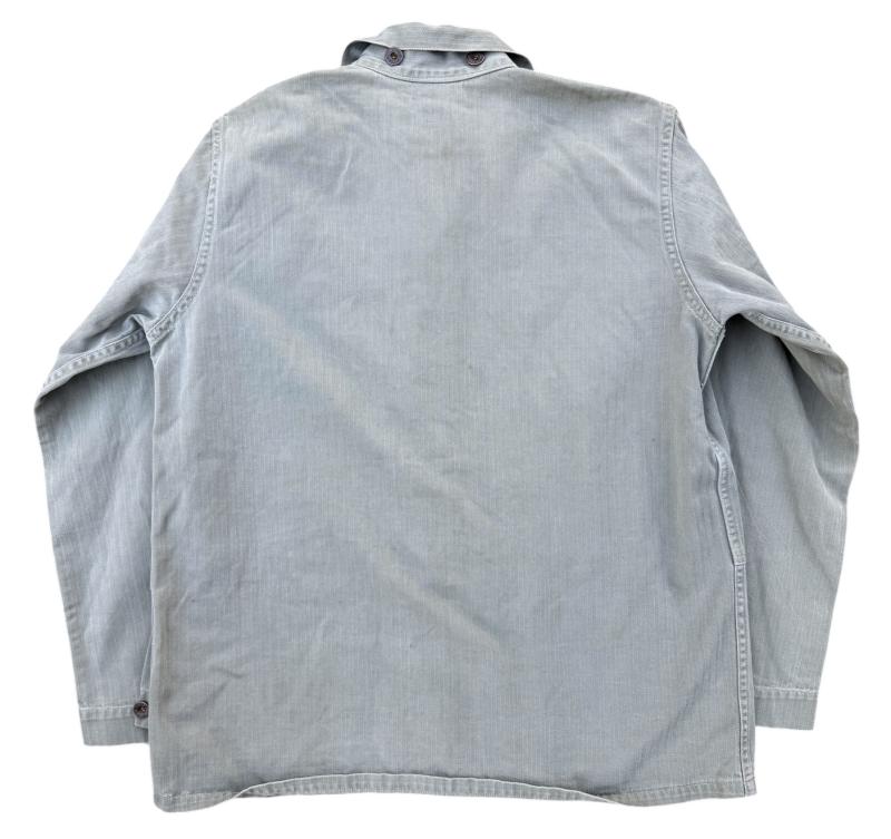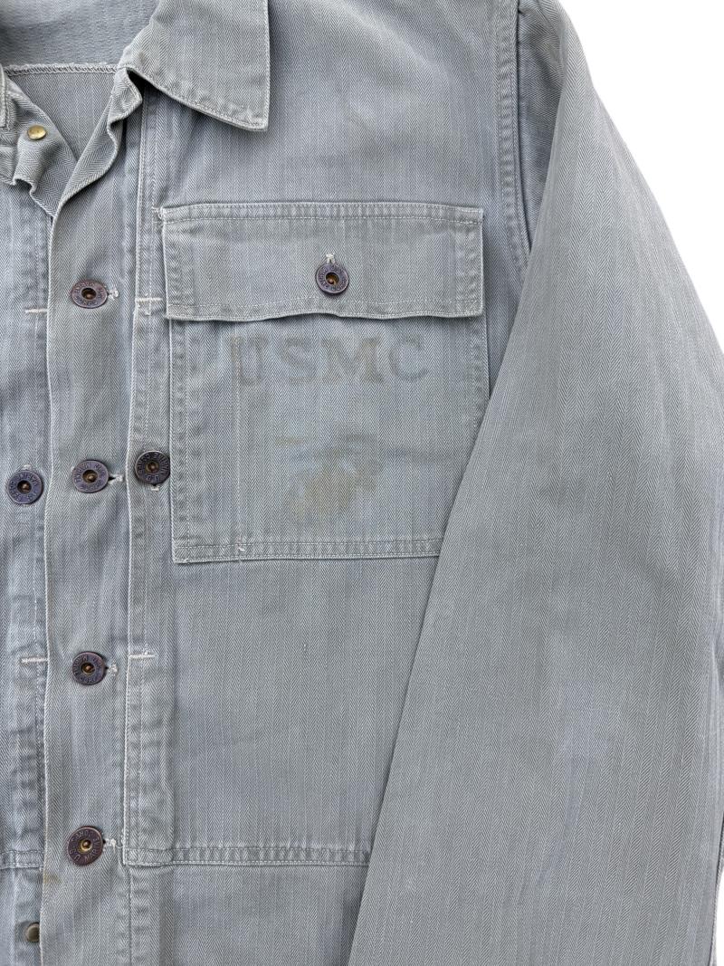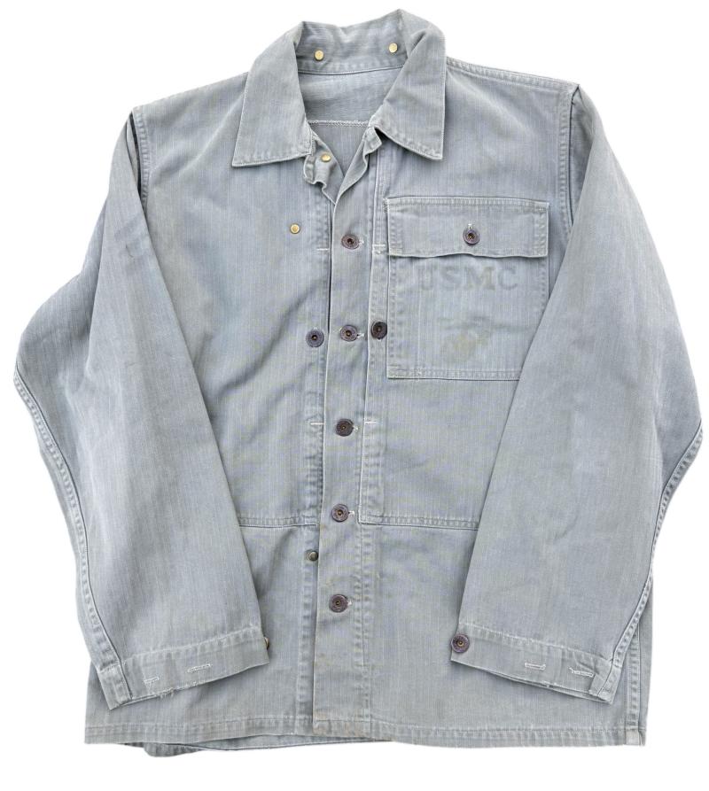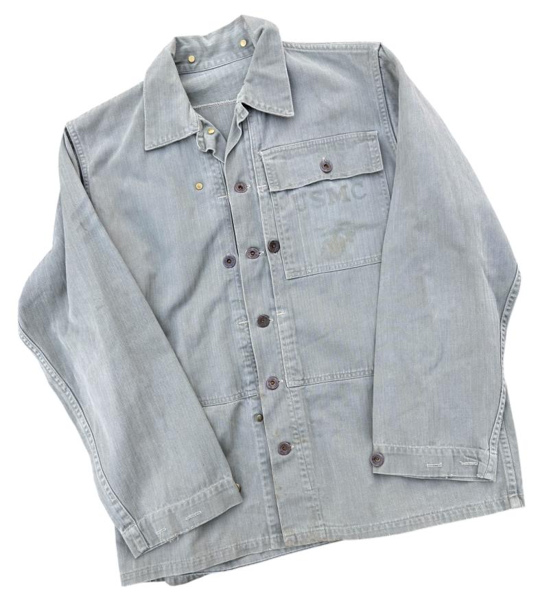 HBT combat tunic & trousers as used in the pacific theatre. All metal buttons “USMC” marked