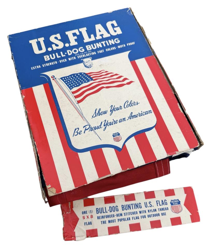 Very nice US WW2 48 star flag in its original clipboard box. Made by “Bull-Dog Bunting”