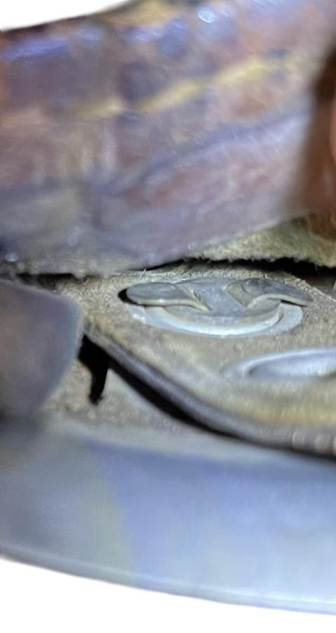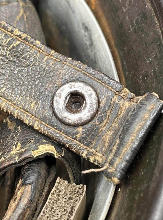 Helmet is maker marked “ET” which is “Eisenhuttenwerk, Thale” in size “68” with its original liner and helmet straps. Liner is originally wartime attached with with regular german helmet cotter pins!