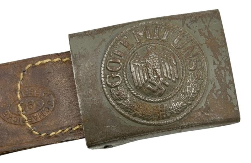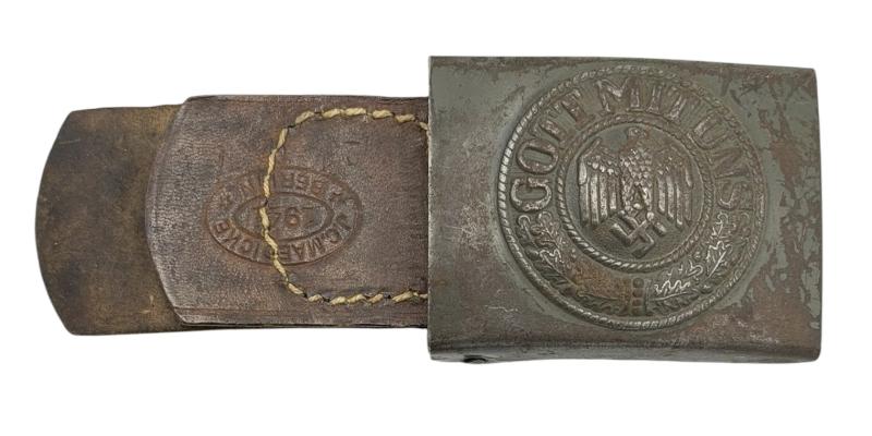 Very nice used Wehrmacht belt buckle with leather tab. In 85% of its original field/grey camo paint