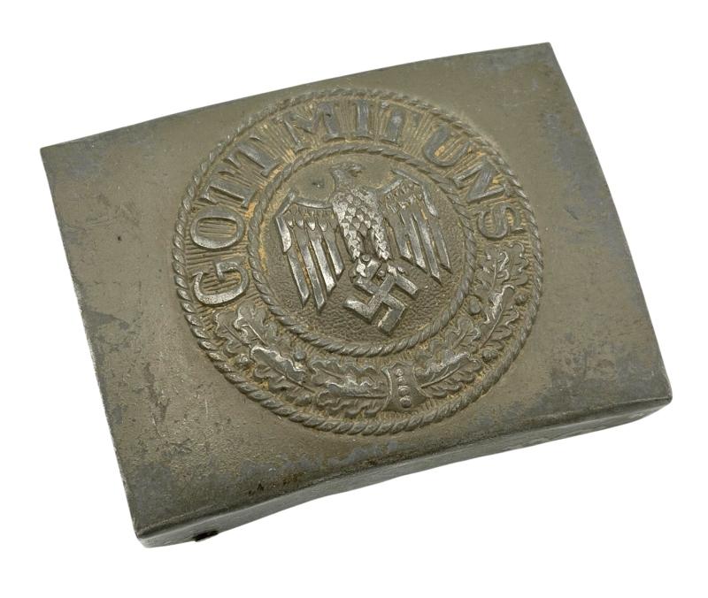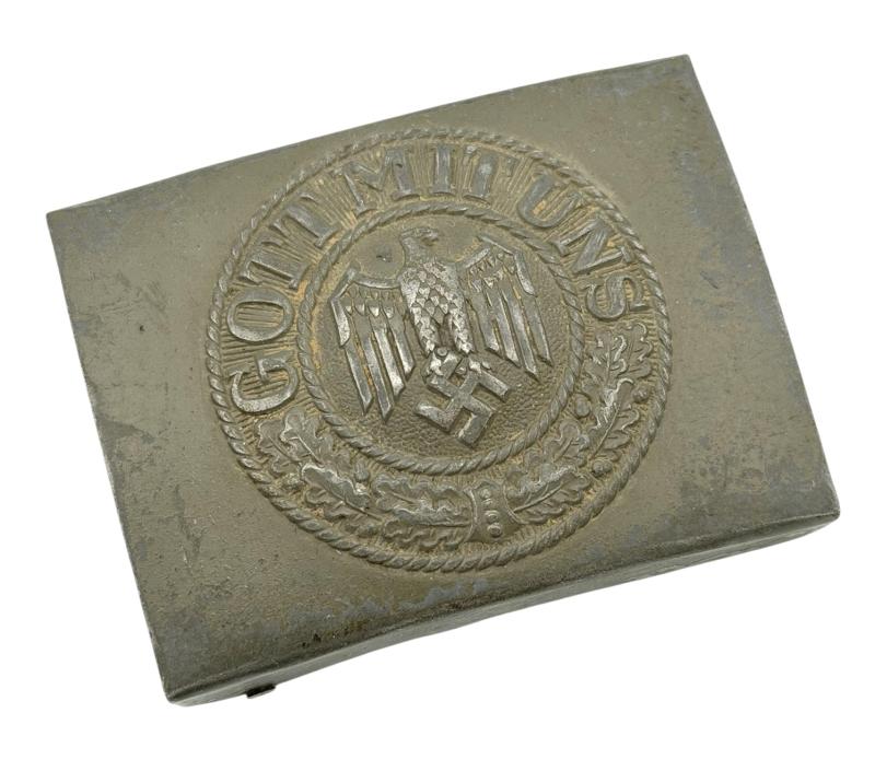 Wehrmacht steel Belt Buckle Nice used un-marked Wehrmacht steel belt buckle In 95% of its original field/grey camo paint. In used but in very good condition. Great to complete a nice Wehrmacht combat belt.