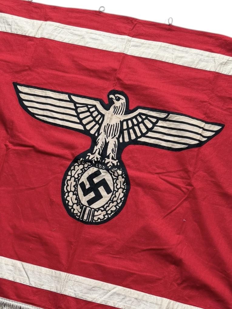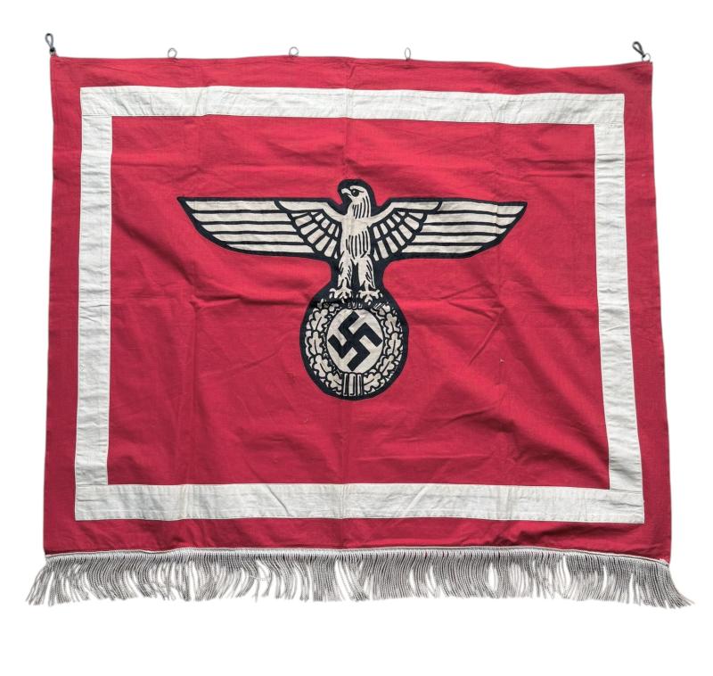 NSDAP Podium Banner Very nice used less common NSDAP podium banner with big white eagle in 96cm x 72cm All attached rings and hooks are present. In used but in very good condition. Very decorative!