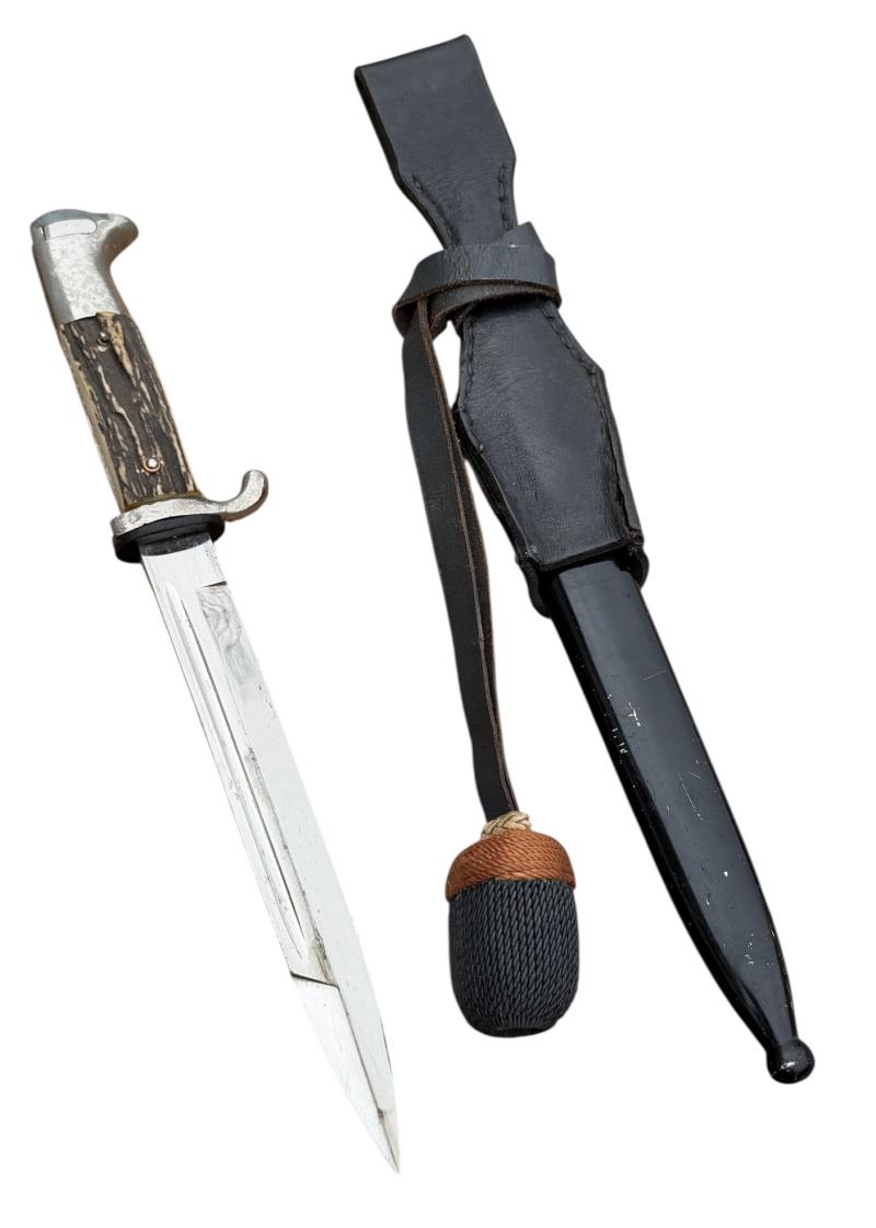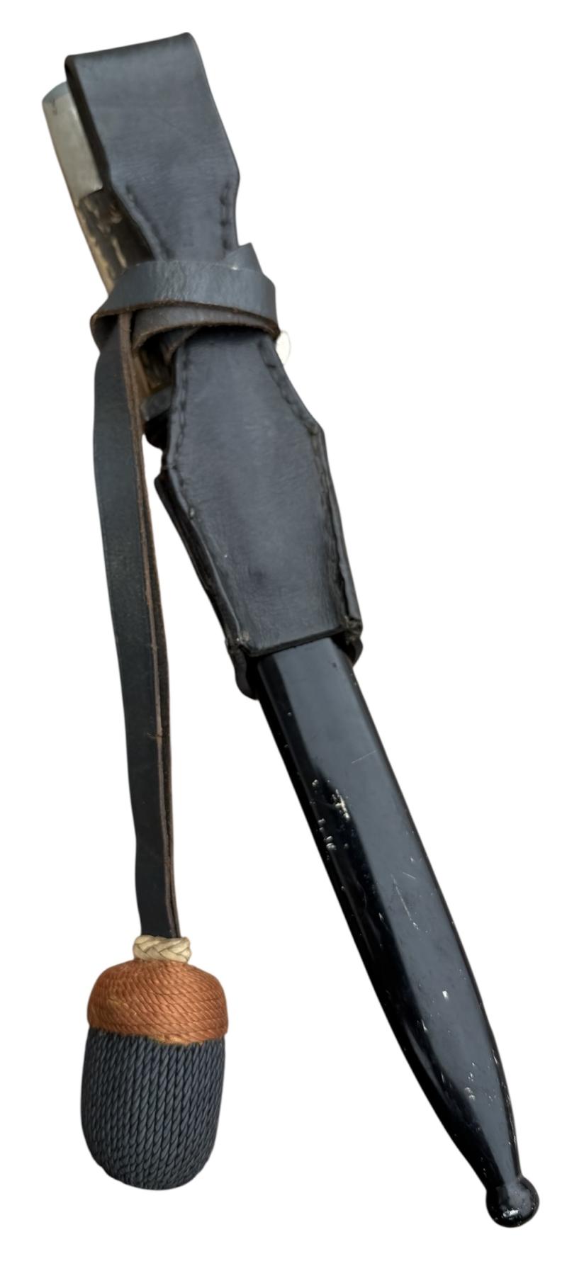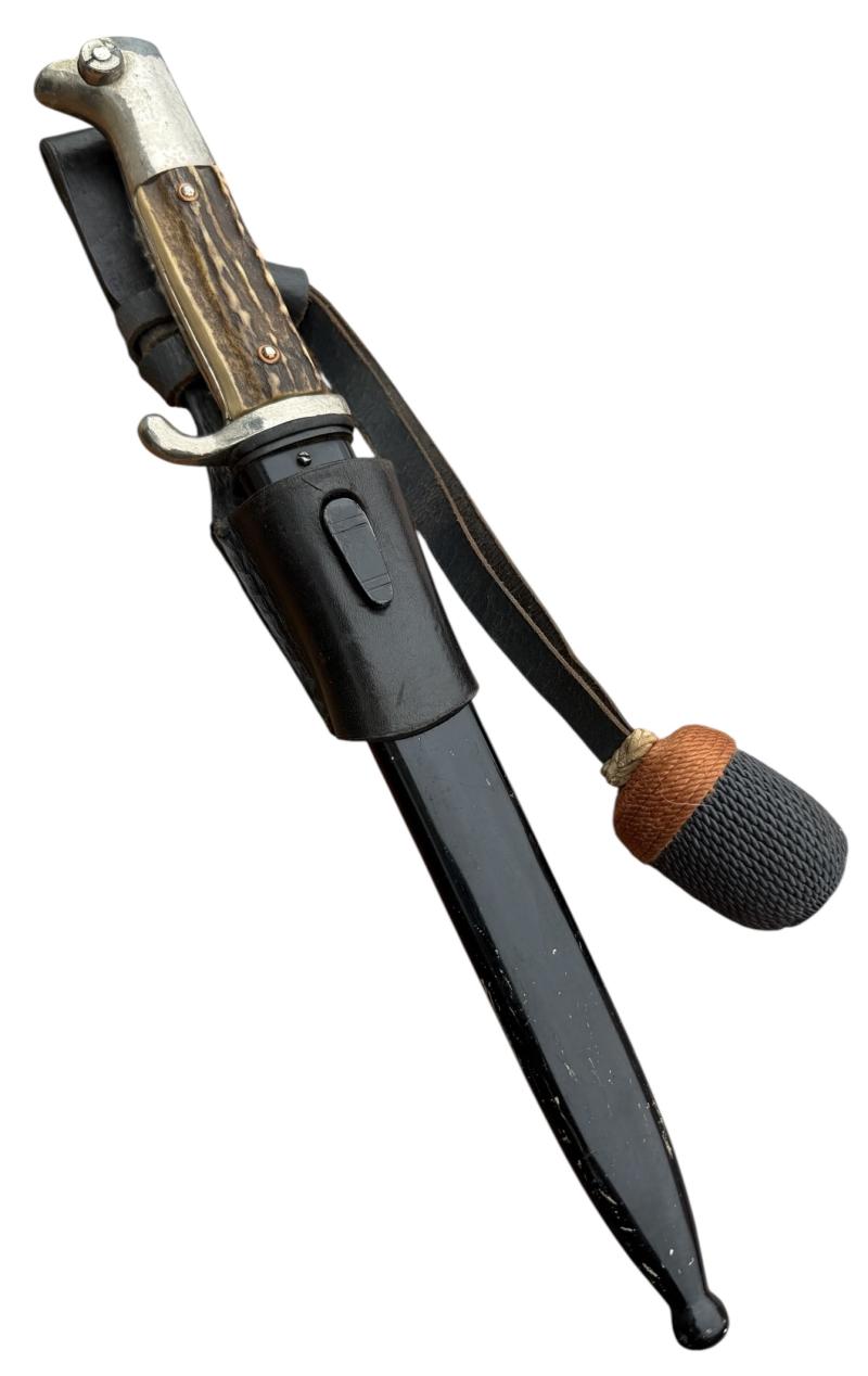 Used but very nice Wehrmacht dress bayonet with its original metal scabbard in its original black paint with leather frog and porte pé. With so-called “Stag Horn” grips. Non maker marked. With “Artillery” felt present