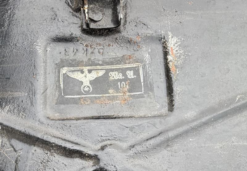 Very nice original Wehrmacht MG34/42 ammunition box case. These metal cases where attached in the Wehrmacht bicycle (Truppen Fahrad) frame and would hold a standard MG34/42 ammunition box “Patronen Kasten” with 300 rounds. This sample comes in its original black paint and is “1942” dated maker code marked. And in nice used condition for use on the nice Wehrmacht bicycle!