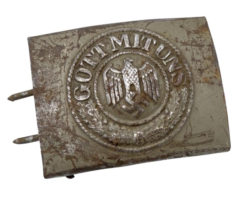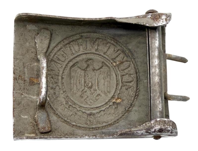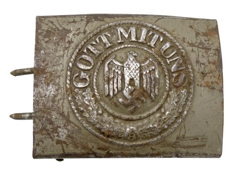 Wehrmacht steel Belt Buckle Nice used un-marked Wehrmacht steel belt buckle In 80% of its original field/grey camo paint. In used but in very good condition. Great to complete a nice Wehrmacht combat belt.