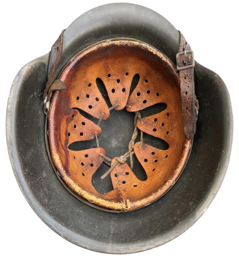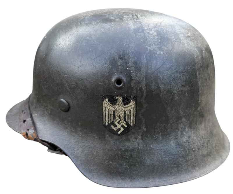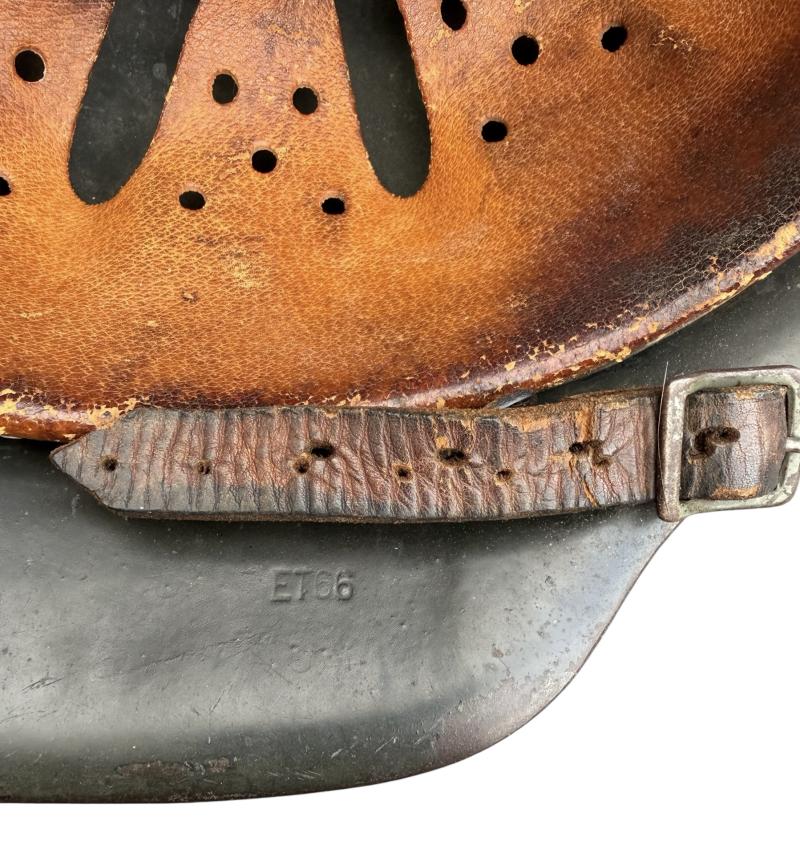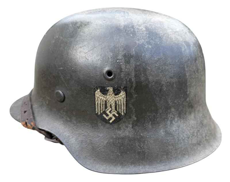Very nice used and untouched Wehrmacht M42 SD two tone camo helmet. Maker code marked “ET” which is “Eisenhuttenwerk Thale” in size “66” its original liner in size “58”. The liner string is period replaced by a leather string. Complete with its original leather helmet strap. The Wehrmacht M42 helmet comes with a two tone camo paint. The basic field/grey camo paint with a grey/white camo paint on top. The decal is in 98% condition.
