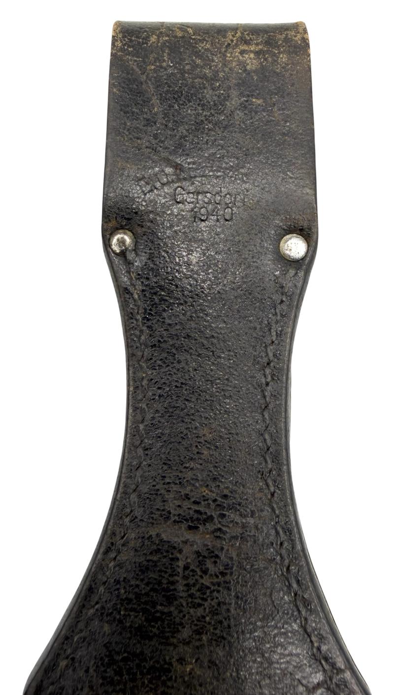 Bayonet with nice Bakelite grips and leather frog, maker marked and dated “1940”