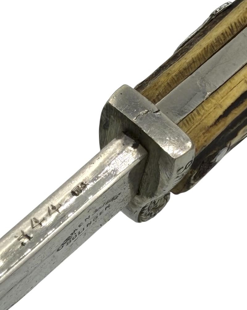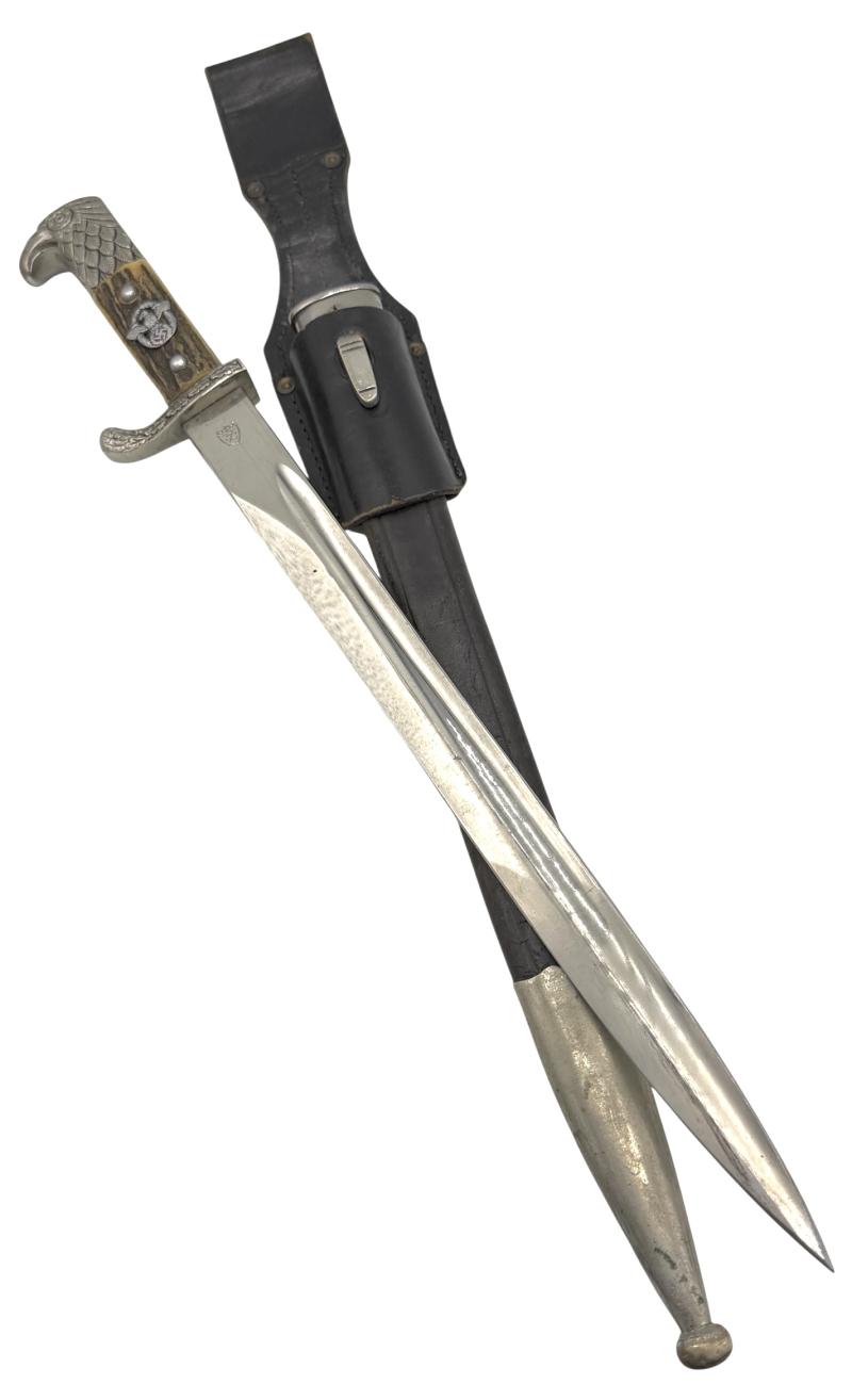 With its original matching numbered metal with leather scabbard. Stag horn grips with metal “Polizei” eagle in the grip. In used but in very good condition.