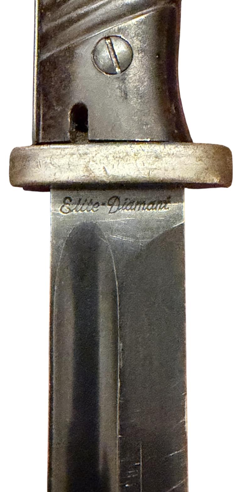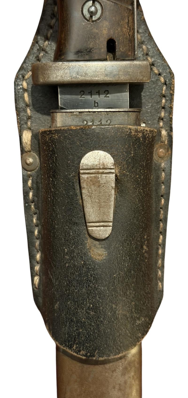 Nice used K98 bayonet with matching numbers “2112 b” maker marked “Elite-Diamant” a desirable maker! and dated “1940” in the back of the blade.