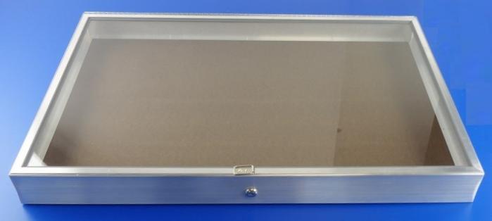 The showcase is made of an Aluminium edited border with a hardboard bottom and a thick safety glass top!