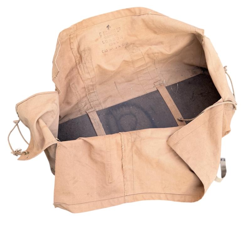 “Holdall” carrying bag. Would hold the Officers folding bed, sleeping bag, clothing and personal items for transport. Nicely maker marked “C.Groom Ltd. Makers, London” and dated “1941”.