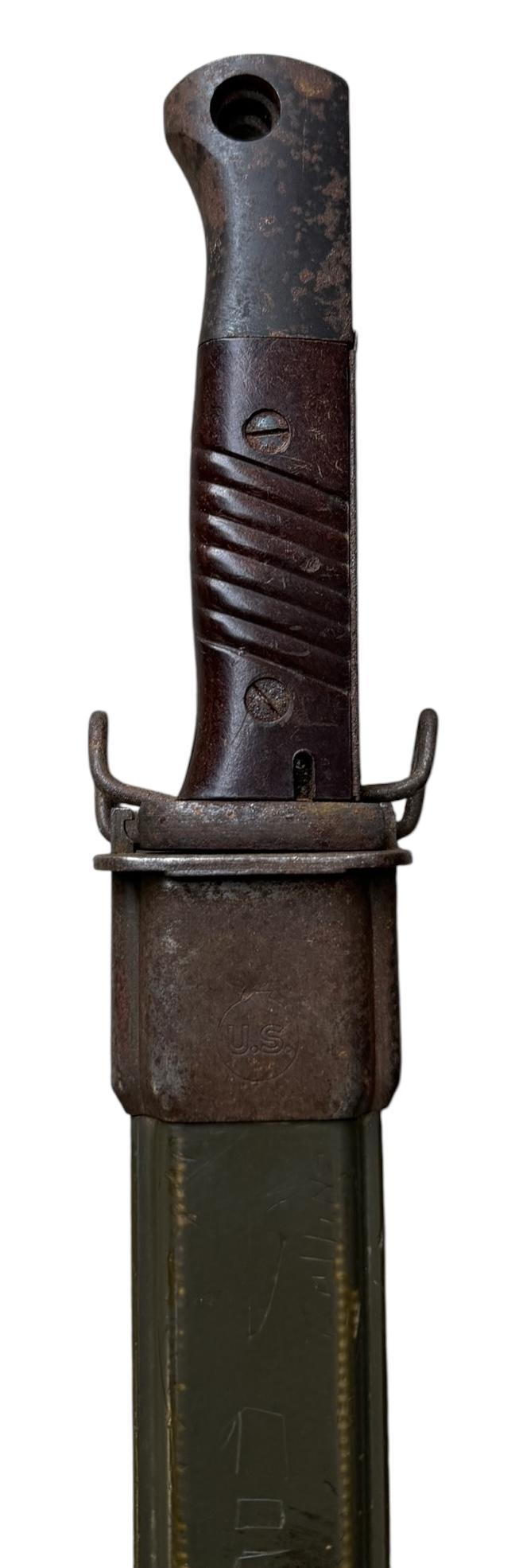 K98 bayonet maker marked “44 FFO” in an American WW2 veteran’s “Garand” bayonet scabbard.