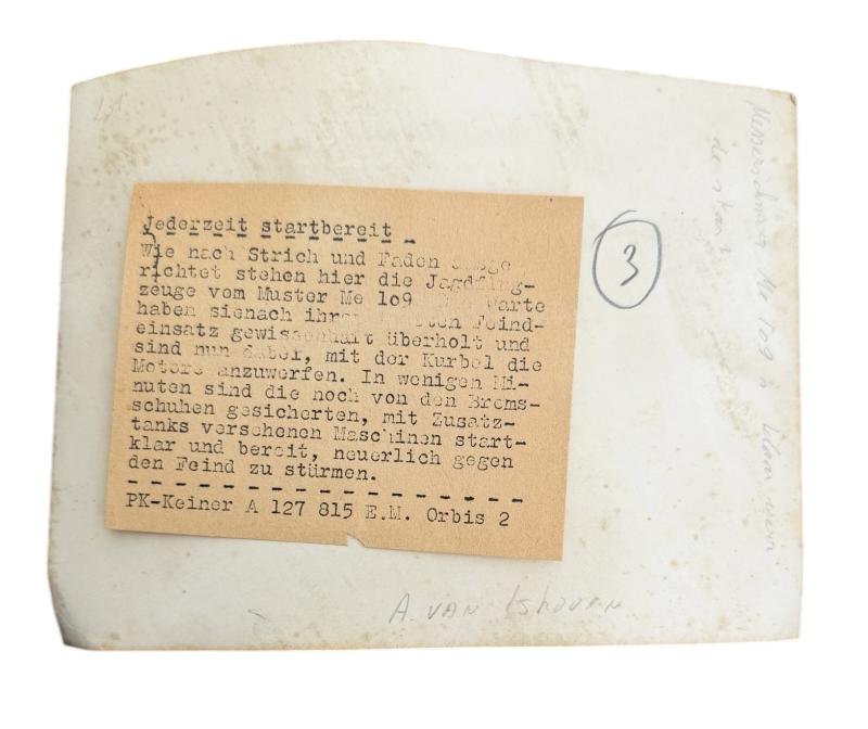 Luftwaffe Press Photograph (PK Bild) Nice original and official Luftwaffe “Press” photograph With ME109 airplanes “Jederzeit Startbereit” “Propaganda Kompanie” der Luftwaffe” In good condition.