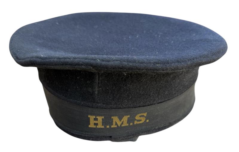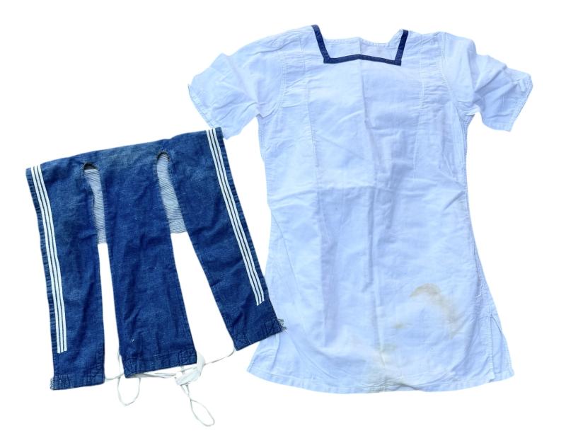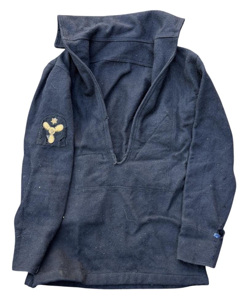 With woven (Stoker) sleeve patch (one woven in red tread, one in gold) a regular white British salors shirt and a blue salors collar, wool socks and a money belt. All in used but in very good condition. Great on a buste in a display!