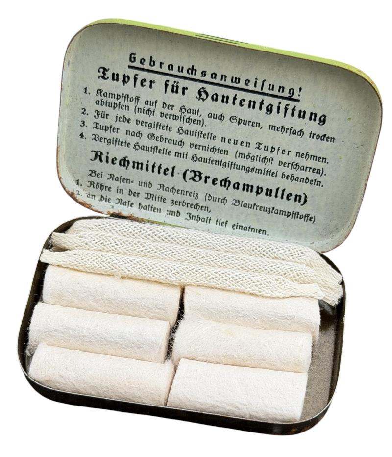 Nice metal Wehrmacht case with combat gas set protection kit. “Tupfer für Hautentgiftung”